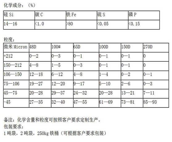 实际生产中应用较多的是新疆重介质硅铁,这是一种专门冶炼成的硅新疆铁合金,具有耐氧化,硬度大,带强磁性等特点。使用后经过筛分和磁选回收,可以返回再用。硅铁中含硅小于13%时,韧性增加,给磨碎制备带来困难,而且在水中易于氧化,当含硅超过18%时,磁性减弱不便回收。故以含硅14%-16%,含铁>80%的硅铁适合使用,冶炼成块状的硅铁需经磨碎后使用。